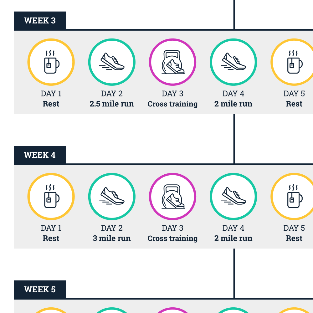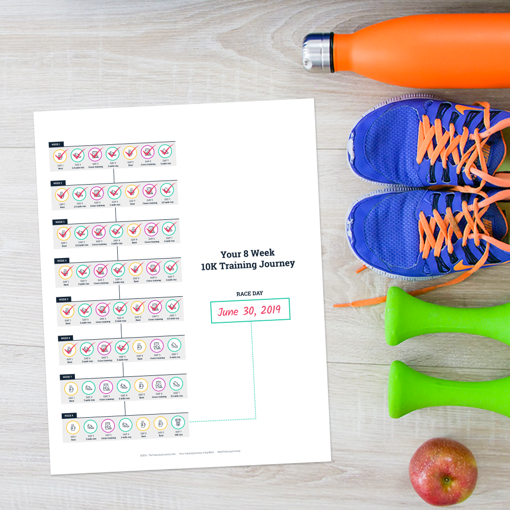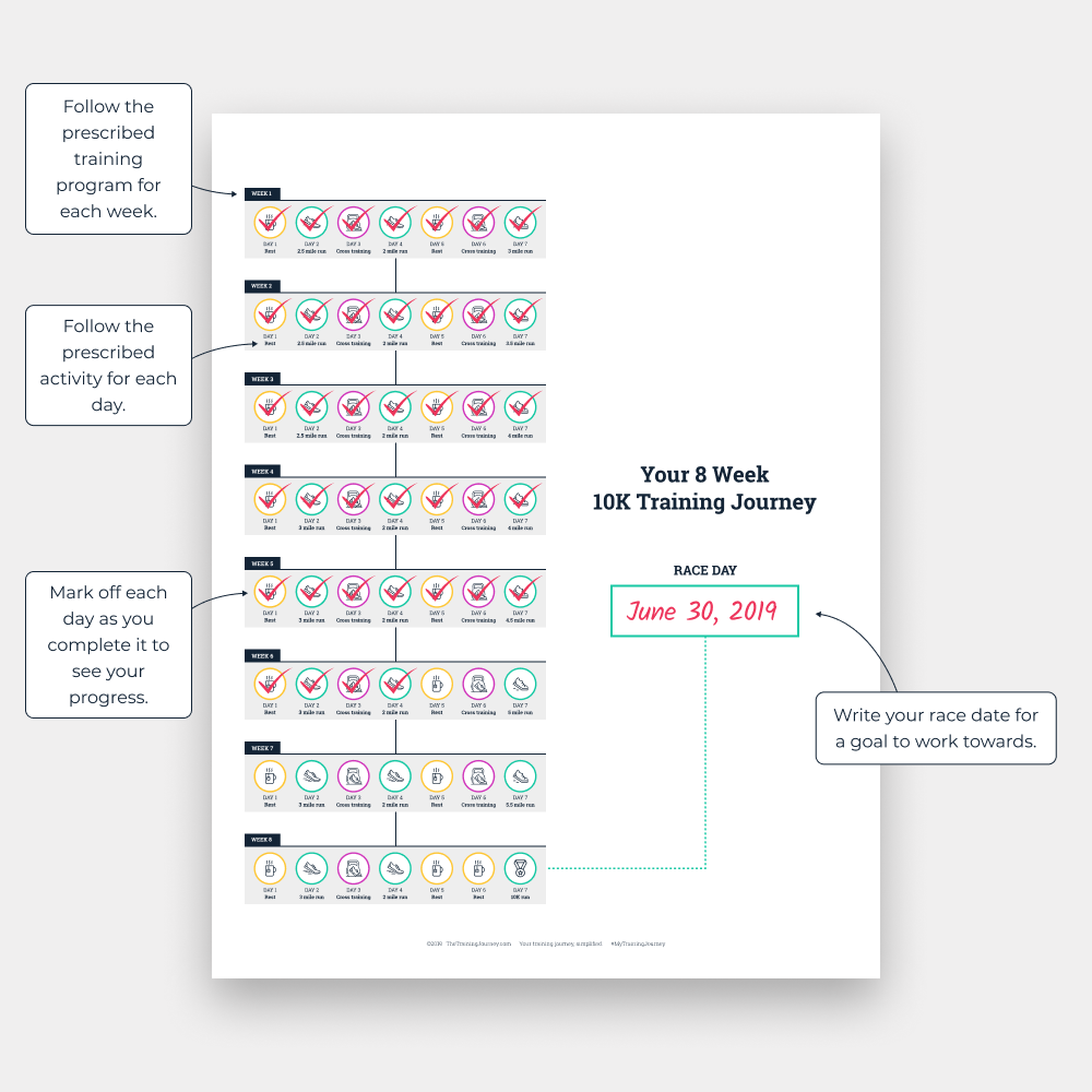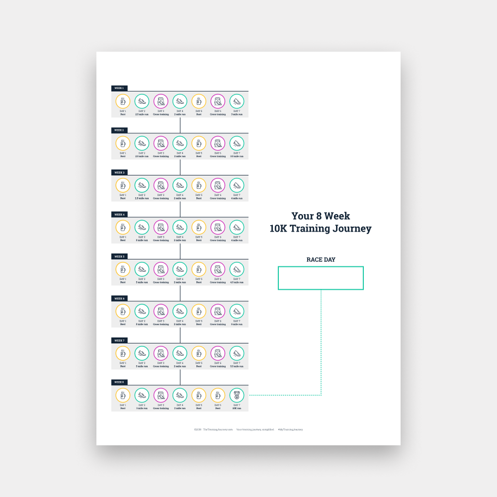 Achieve your 10K run training goals with this simple straightforward training visual guide. This 10K program was designed for new runners looking for a training program to prepare them for a 10K race. It's also great for experienced runners who are looking for an easy schedule involving a relatively low level of weekly miles. This training program will get you to the starting line and the finish of the 6.2 mile run, while providing a clear indication of your race goal and day-to-day training progress. Before starting to train for a 10K run, you need to possess a basic fitness level. Most healthy people can train to complete a 10K race. This training plan will guide you through the training process.
